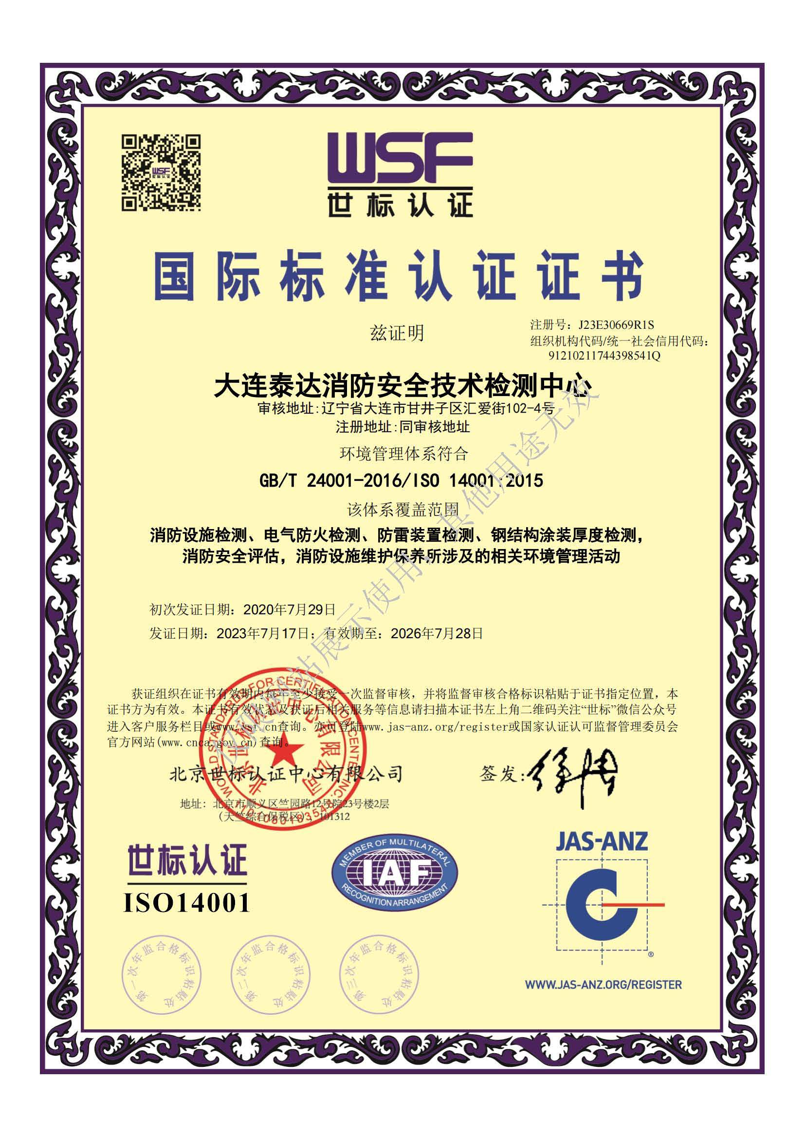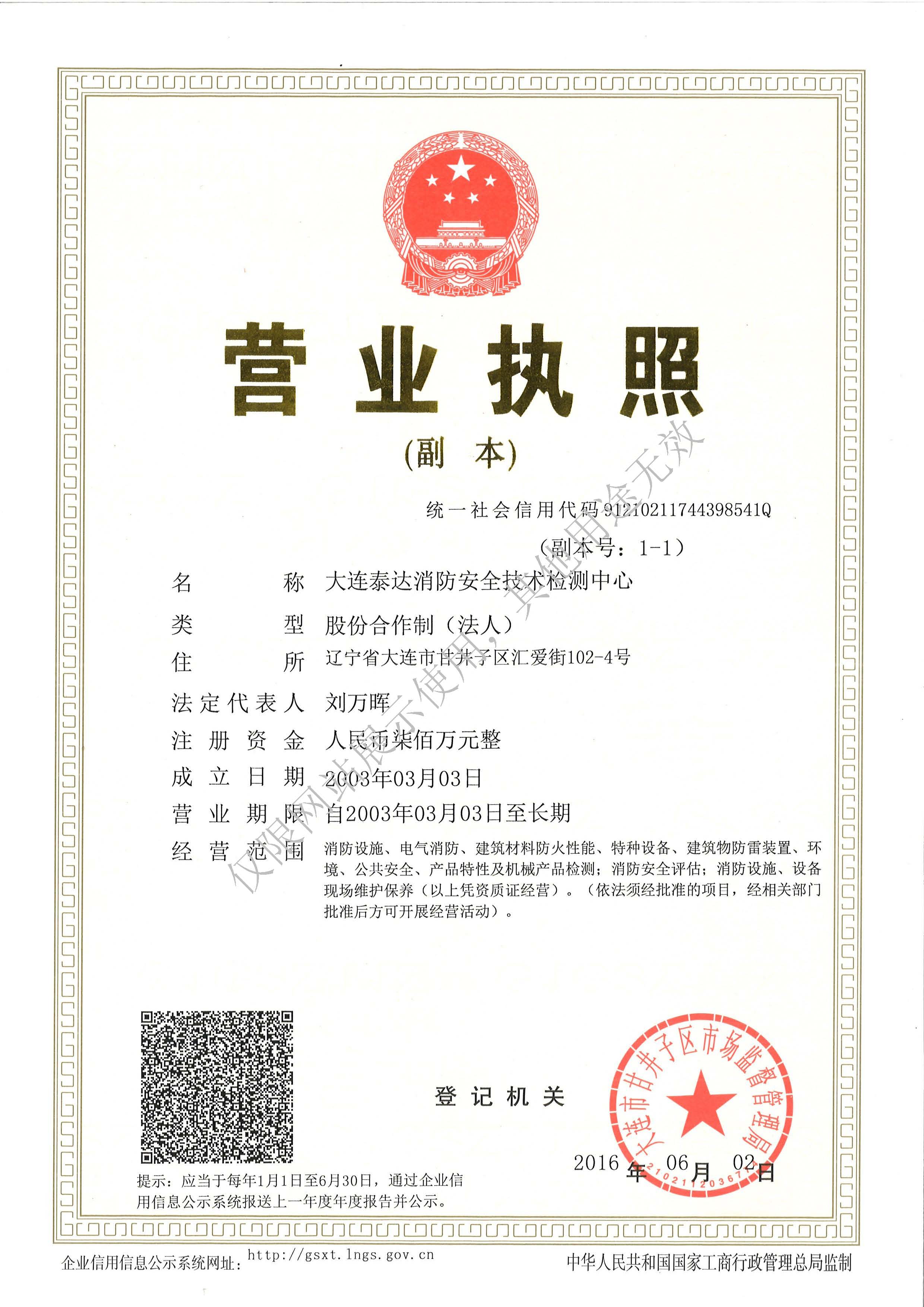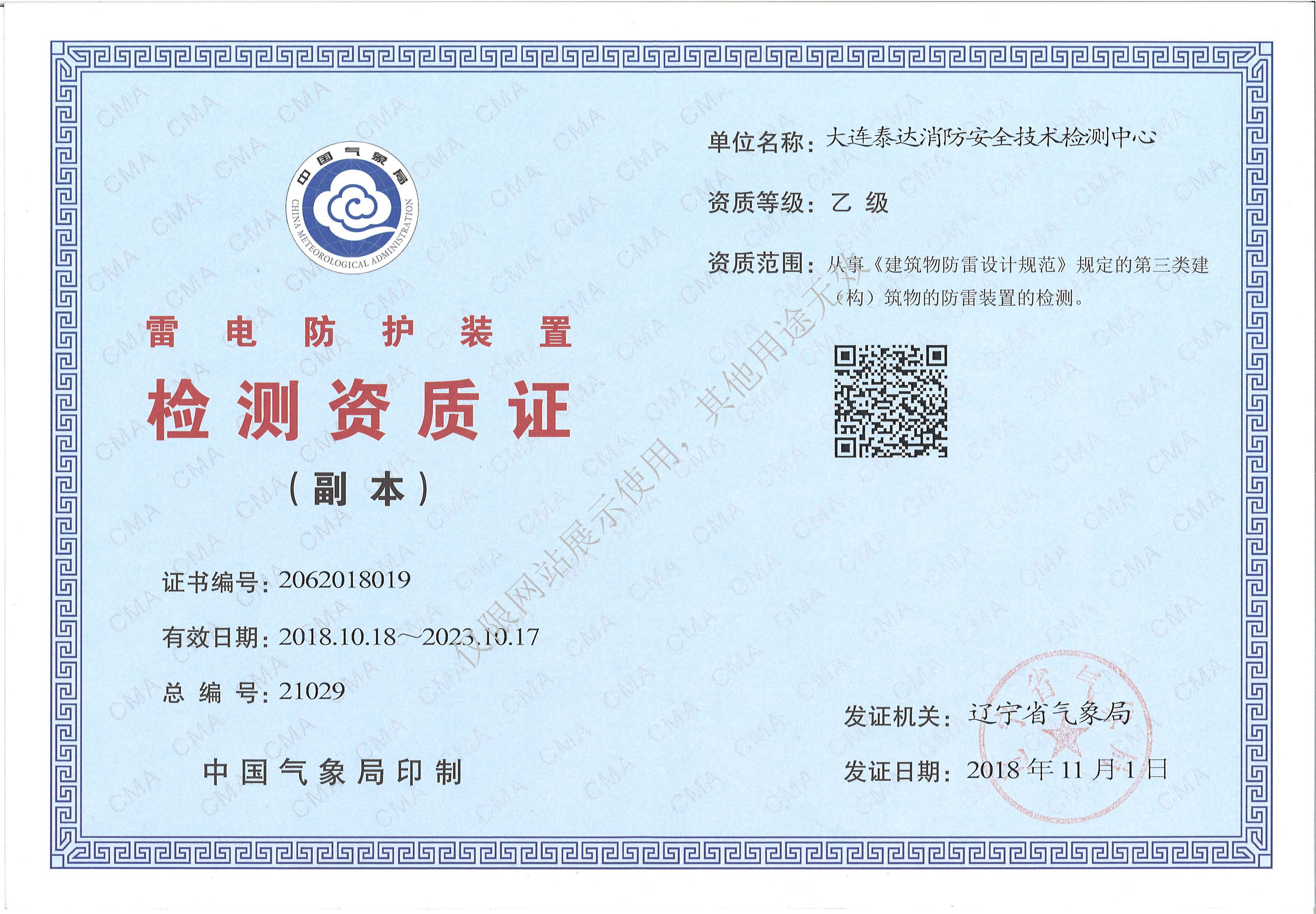 · 是經“社會消防技術服務信息系統(tǒng)”備案并公示的消防技術服務機構,已取得中國氣象局頒發(fā)的雷電防護裝置檢測資質證書、遼寧省質量技術監(jiān)督局審核批準的檢驗檢測機構資質認定證書(CMA)及包括消防檢測、電氣檢測、雷電防護裝置檢測、防火涂層厚度檢測等在內的200余項檢驗檢測能力,取得大連市應急管理局頒發(fā)的安全生產標準化證書,獲得質量管理體系、環(huán)境管理體系、職業(yè)健康安全管理體系認證證書,是經備案的高新技術企業(yè),可獨立出具具有證明作用的檢測報告。